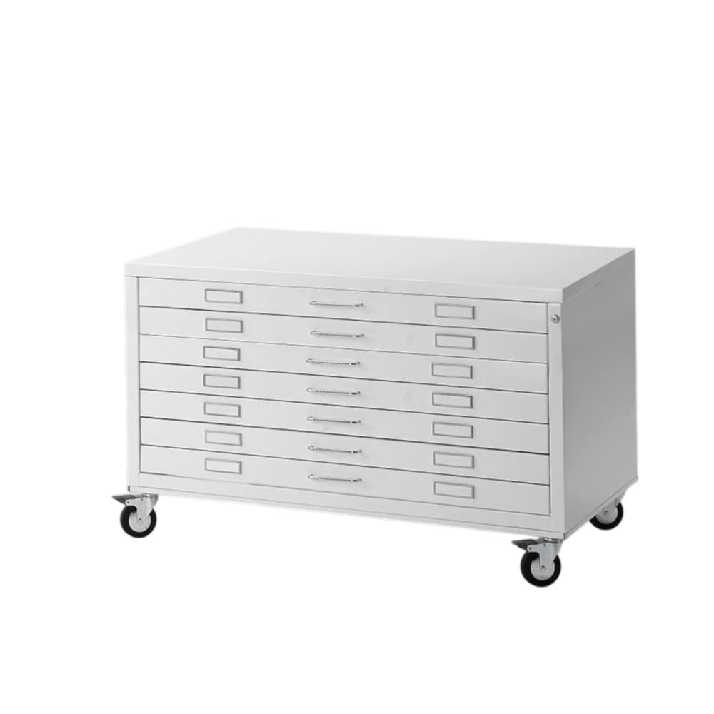 La Cassettiera Draftech Formato A0 con base su ruote, presenta 7 cassetti con estrazione massima di 2/3, che scorrono su cuscinetti a sfera. Tutti dotati di serratura.